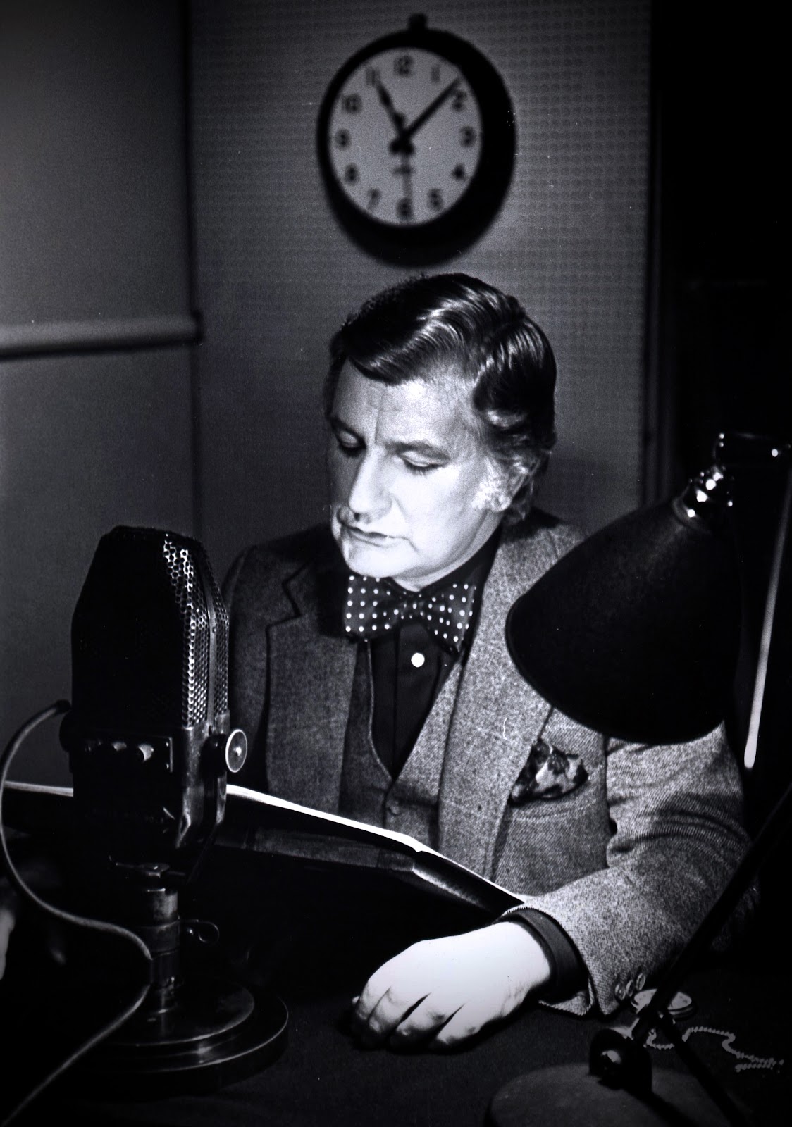 A very pleasurable part of TP's career was his radio work, but on this occasion he's merely faking it. It's a real studio alright, but the mic is a prop and he's pictured in a scene from the short film, A Child's Voice, which he made with independent film maker, Kieran Hickey. He plays a Valentine Dyall figure, an actor called Ainsley Rupert Macreadie, who writes and reads late night ghost stories on the radio. His latest story involves a magician and the young boy he employs for his newest sleight of hand involving a box into which he makes the child disappear. However, there's a chilling twist in the tale when the storyteller becomes haunted by the voice of the child who begs not to go back into the box.